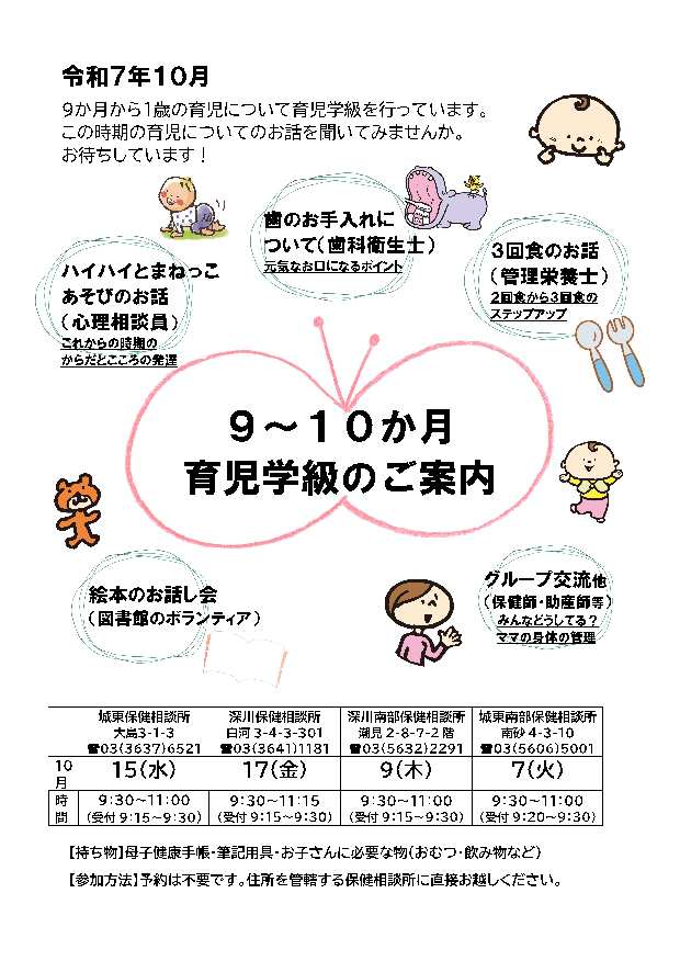 深川南部保健相談所  10/9(木)9:30~11:00(受付9:15~9:30)