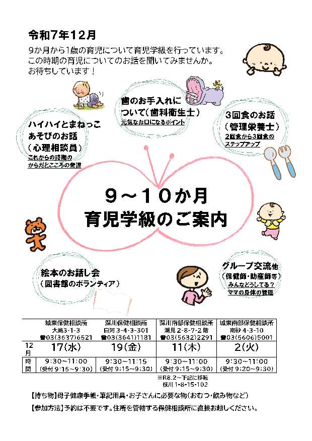 深川南部保健相談所 12/11(木)9:30~11:00(受付9:15~9:30)