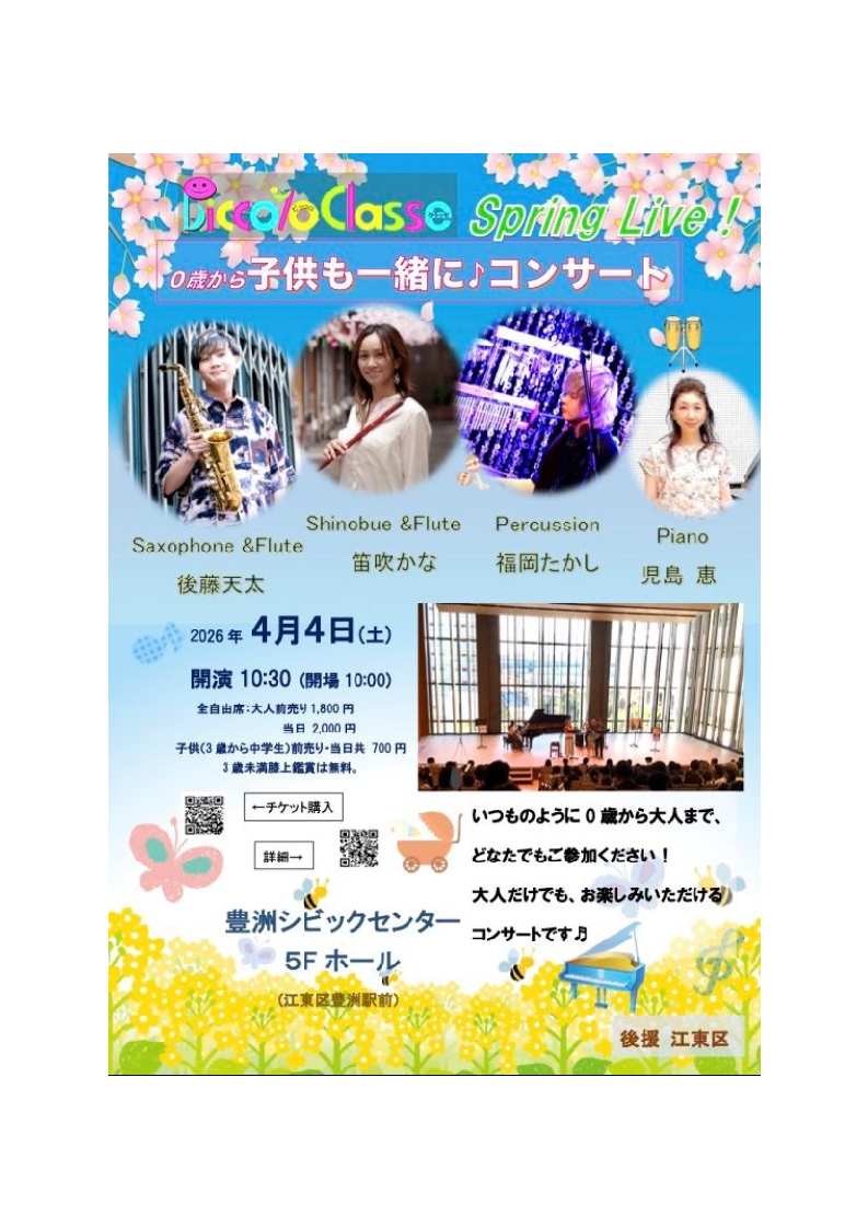 【内容】0歳の赤ちゃんから大人だけでもお楽しみ頂けるコンサート。フルート(篠笛も)、サックス、パーカッション、ピアノの4人で、クラシックからJ-pop、アニメの楽曲などたっぷり演奏致します。楽器のお話やリズム遊びなどを交えて1時間弱。途中入退場もできます。舞台の向こうに海の見える、明るいホールで。