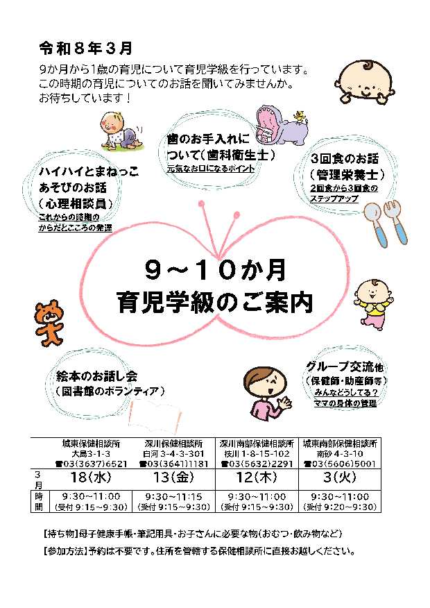 深川南部保健相談所 3/12(木)9:30~11:00(受付9:15~9:30)