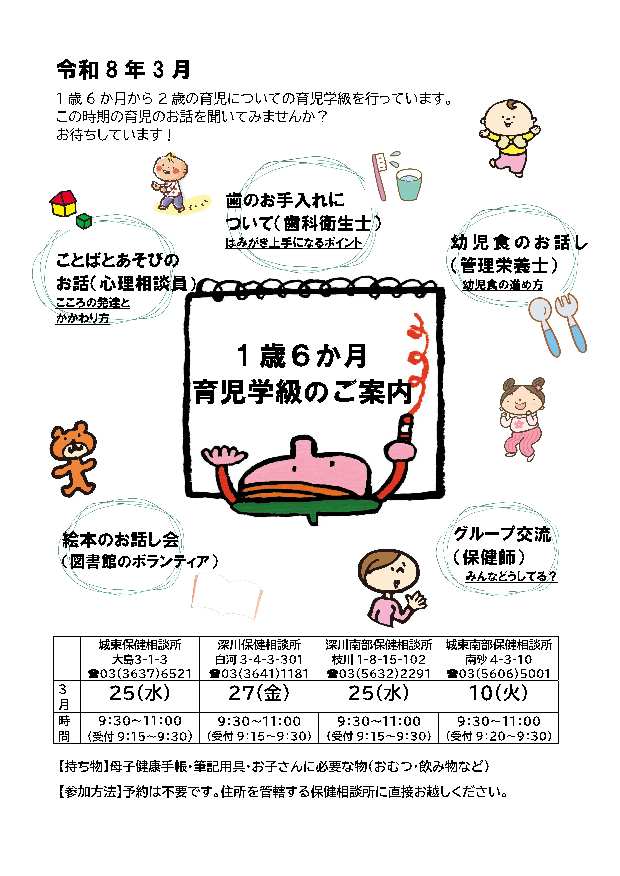 深川南部保健相談所 3/25(水)9:30~11:00(受付9:15~9:30)
